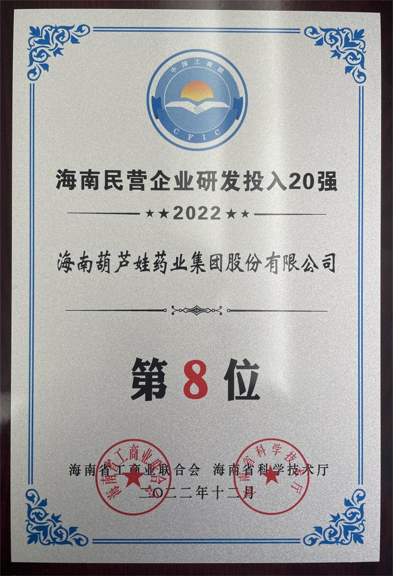 12月23日,2022海南民营企业50强和研发投入20强发布会在海口举行。会上发布了“2022海南民营企业50强”“2022海南民营企业研发投入20强”榜单和分析报告。AG8旗舰厅药业再次荣登两榜,在海南民营企业50强榜单中位列第25位,较去年上升8位,这也是公司连续三年登榜;在海南民营企业研发投入20强中位列第8位,较去年上升7位。